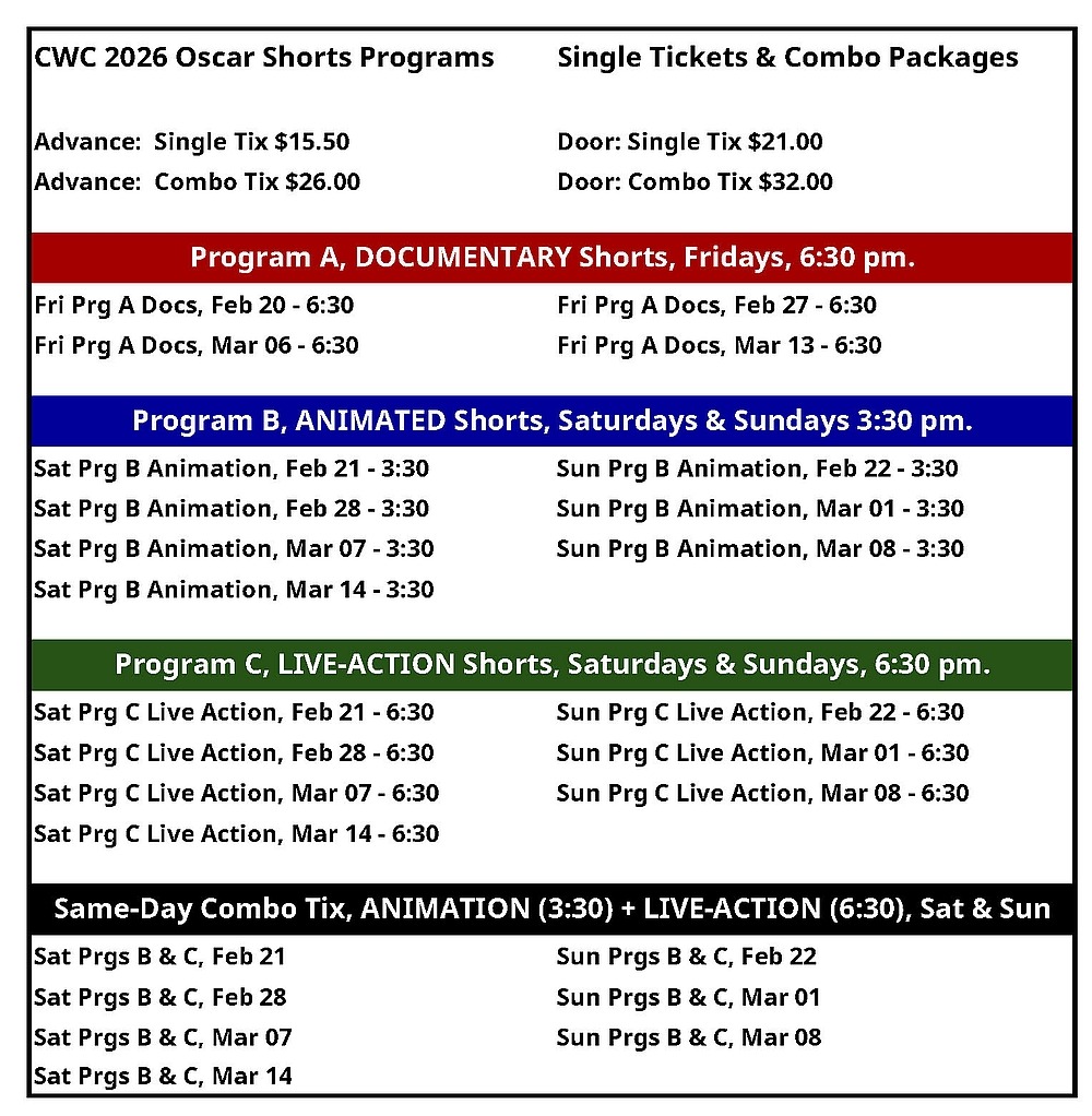 Advance tickets for individual programs are $15.50 each. Same-day combo tickets, Live Action & Animation, Saturday and Sunday, are discounted at $26 for both programs. Tickets at the door are $21 and $32, respectively.